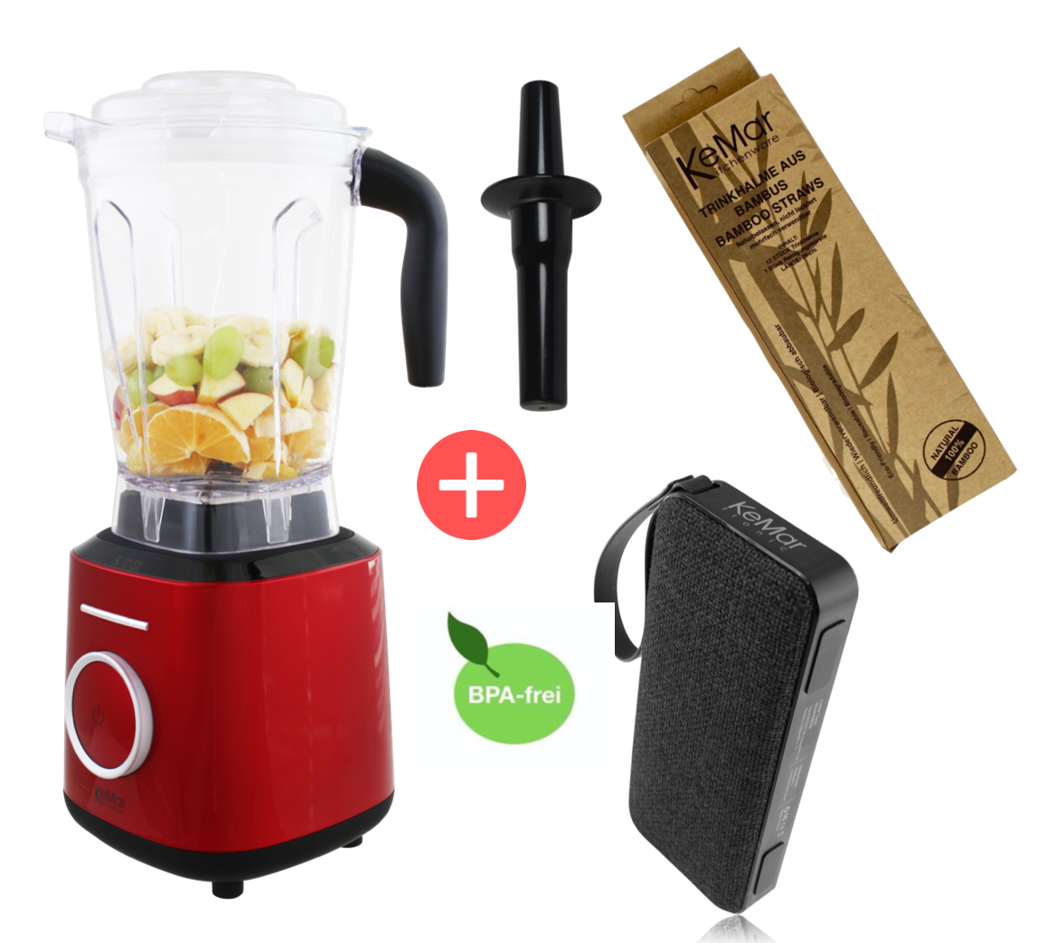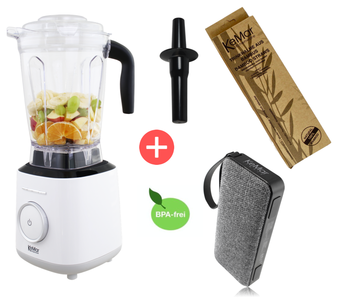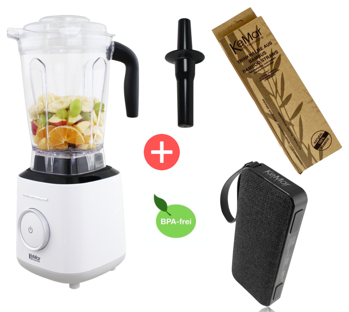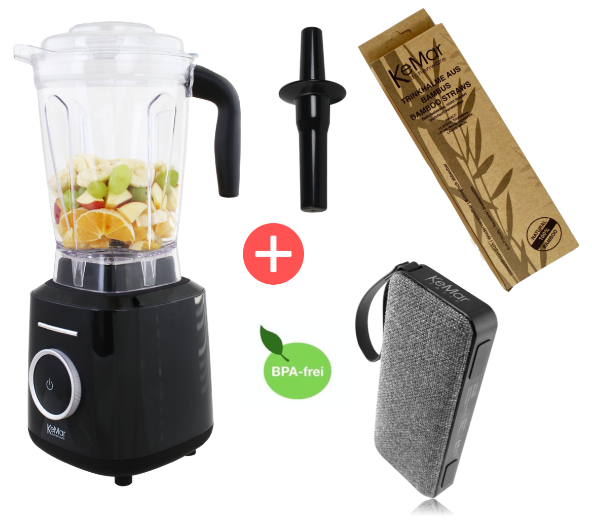 Beim Kauf eines KSB-300 Hochleistungsmixers erhalten Sie im Bundle kostenlos einen Bluetoothlautsprecher KBS50 und eine Packung Bambustrinkhalme mit dazu.