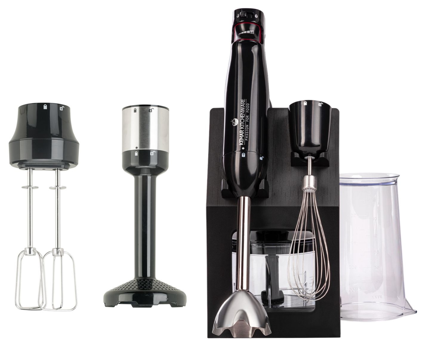 KeMar Kitchenware Handstab Mixer in Edelstahl Design | 1.000 Watt | 17.000 U/min | Stufenloser Antrieb - 4 Stufen | LED Anzeige | Sicherheitsverriegelung | BPA-frei | Titan gehärtete langlebige 4-fach Klinge | 800ml Mix-Behälter | 500ml Mixbehälter mit 2-fach Klinge | Aufsätze aus Edelstahl | Praktischer Aufbewahrungsständer | Gemüse-/Kartoffelstampfer Aufsatz | Quirl Aufsatz