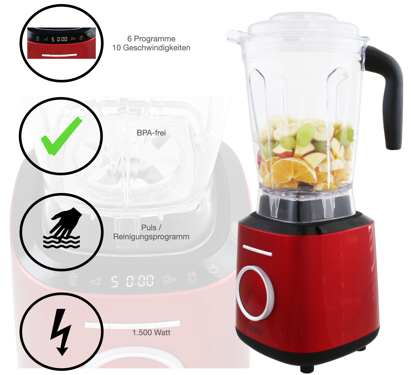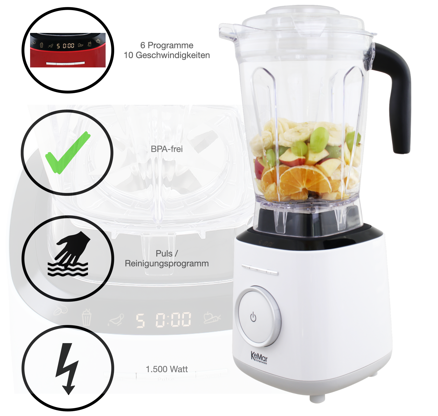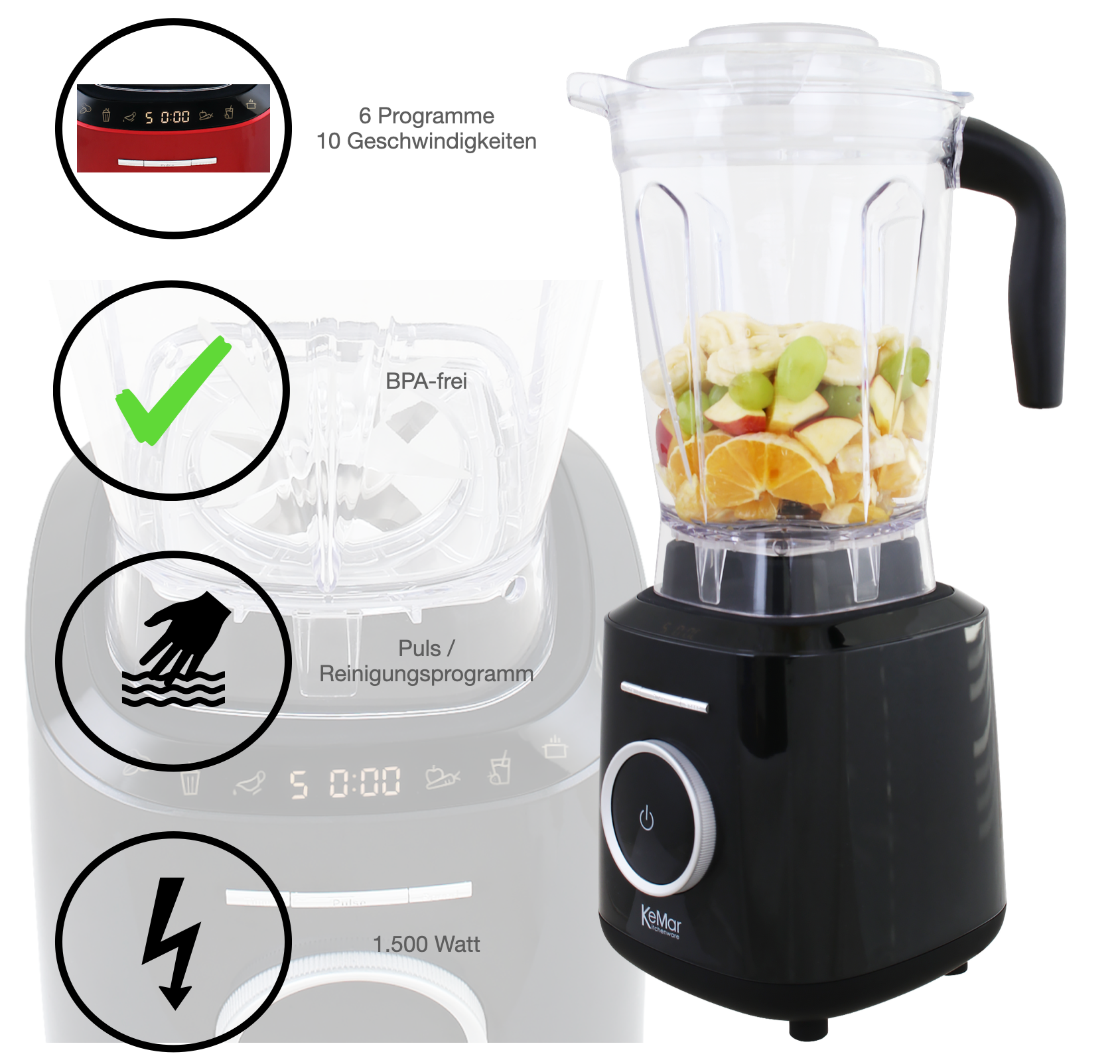 KeMar Kitchenware High Speed Standmixer mit LED Touch Bedienfeld | BPA-frei | 2 Liter Behälter | Smoothie Mixer | Standmixer | Hochleistungsmixer | 23.000 U/min | LED Touch Panel | 10 Geschwindigkeitsstufen | AGS gehärtete Stahlklingen | 2 Liter TRITAN® Behälter BPA-frei | Deckel transparent | Optimierte Behälter Symmetrie für perfekte Mixergebnisse | 6 Autoprogramme | Pulse - Reinigungsfunktion | Manuelle Zeit und Geschwindigkeitsanpassung