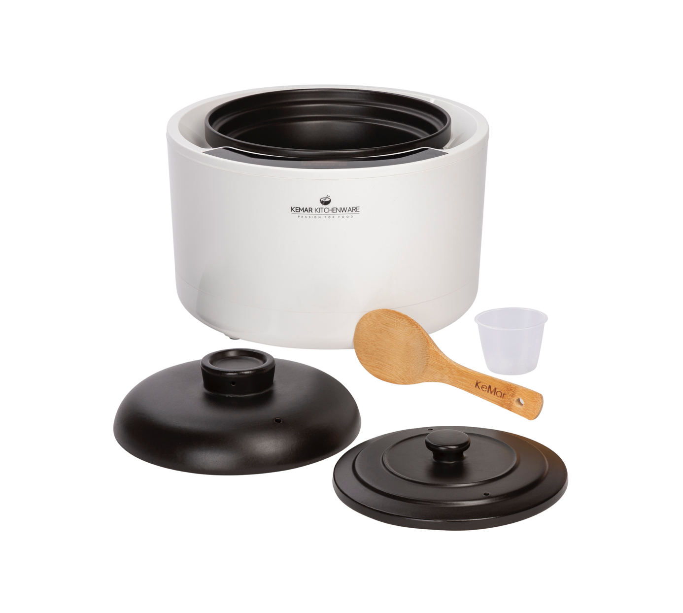Lieferumfang: KCC-280 Multikocher, Keramik-Innentopf mit 2 Deckeln, Messbecher, Bambus-Reislöffel, Netzkabel.