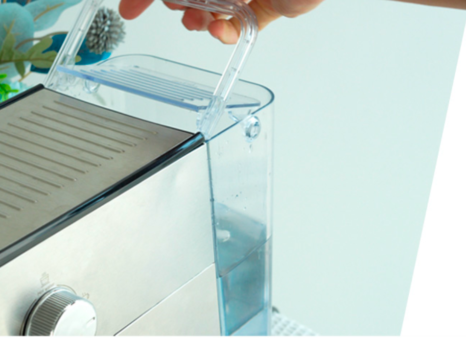 Removable 1.7-liter water tank. The folding mechanism makes it easier to fill with water, and the handle ensures safe transport to the tap.