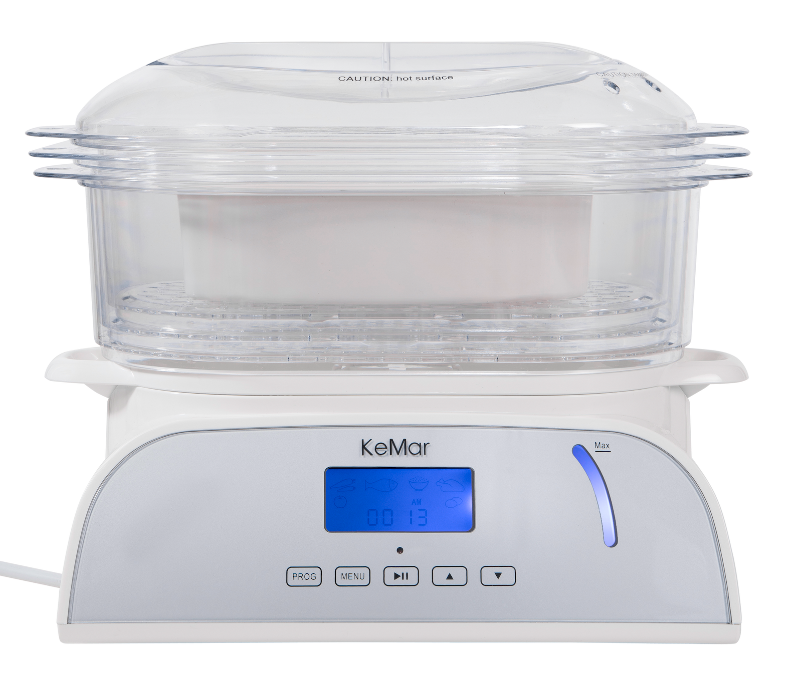 3-in-1 function : With the KeMar Kitchenware KFS-950, you can prepare all types of rice in the separate rice bowl, steam food in the three different inserts , and then automatically keep it warm or reheat it . You can conveniently and easily choose between the six automatic programs or the manual setting via the digital touch display .