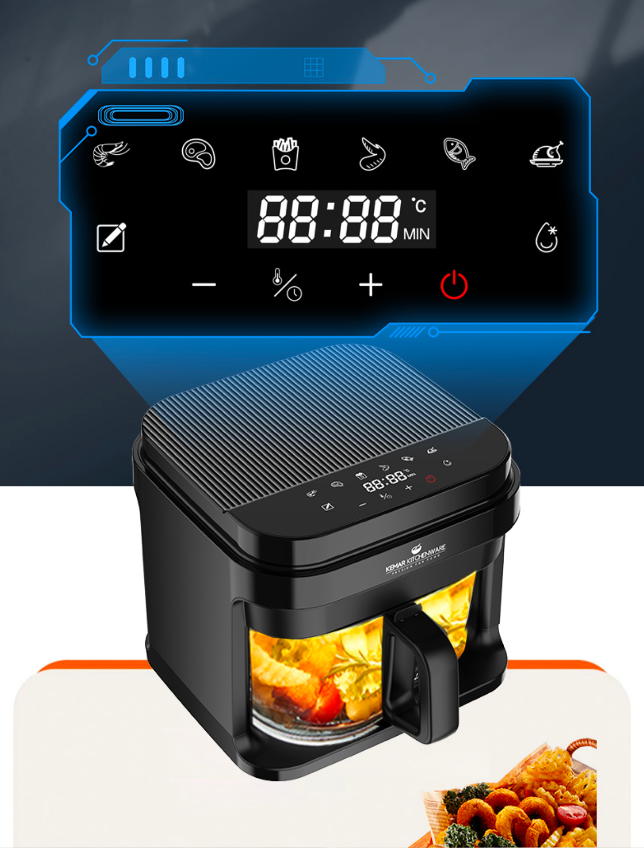 KeMar Kitchenware The KHF-550 air fryer features a touchscreen display, 7 automatic programs, and manual time and temperature settings, as well as a modern and timeless design. The frying bowl is made of uncoated, PTFE/BPA-free borosilicate glass and has a capacity of 5.5 liters.