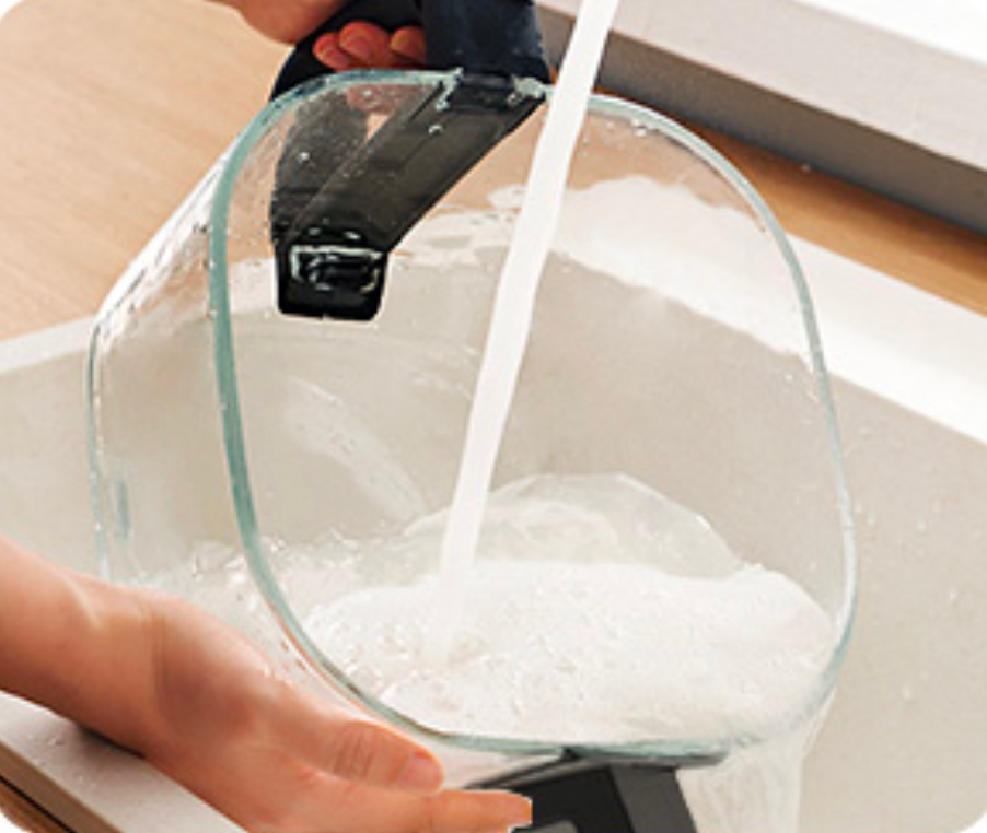 The removable borosilicate glass basket is BPA-free, PTFE-free, and taste- and odor-neutral. It can be conveniently cleaned in the dishwasher.
