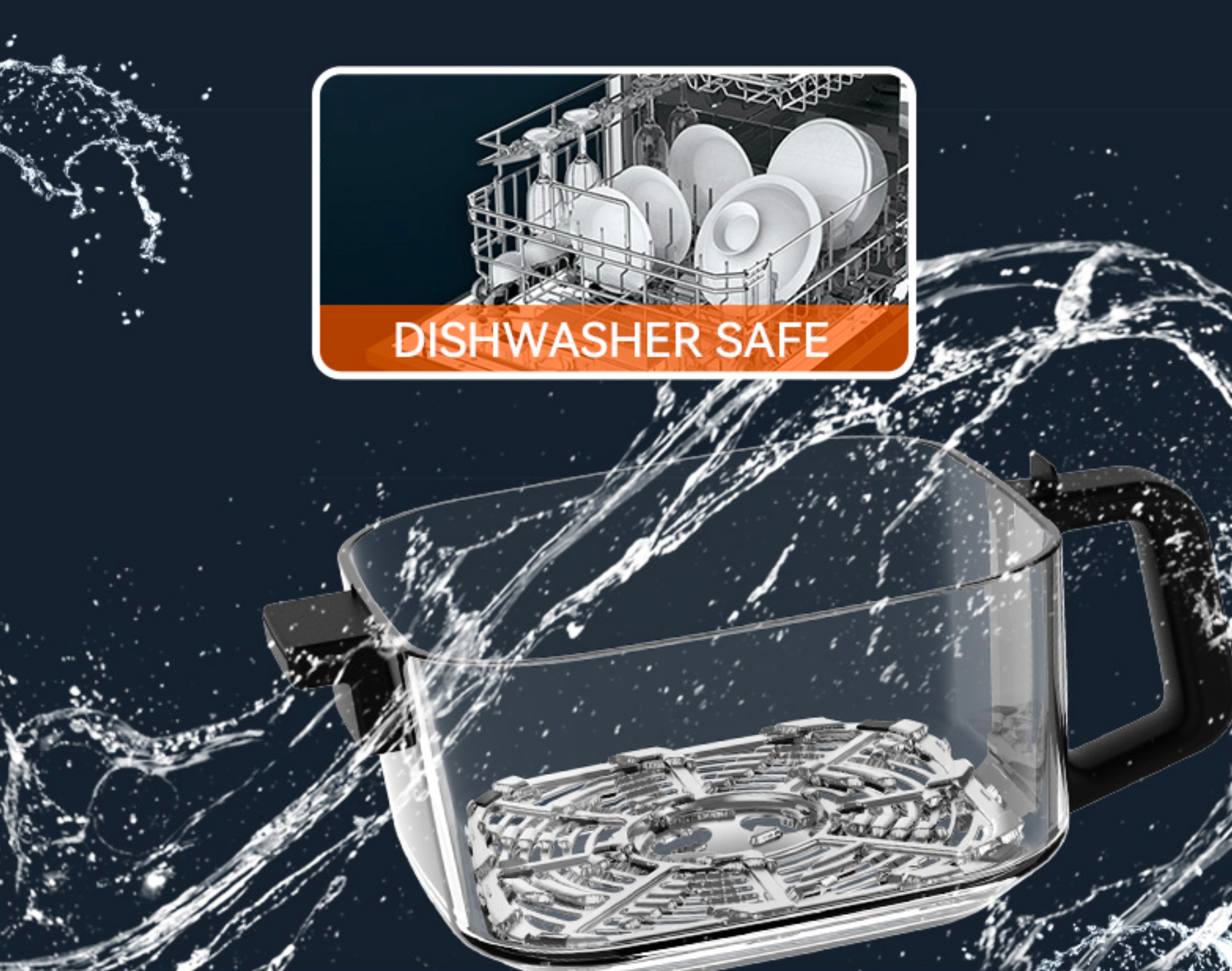After frying, cleaning shouldn't be a problem. Whether by hand or conveniently in the dishwasher, the glass container makes this possible without any problems. You no longer have to worry about the coating being damaged by the dishwasher.
