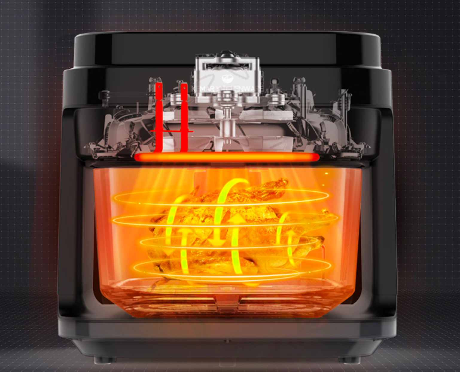 The air fryer achieves maximum energy efficiency while heating food very quickly, thus preserving valuable environmental resources. This technology eliminates the smell of frying oil and dirty ovens and stoves. The heating coil is completely encased in airtight glass.