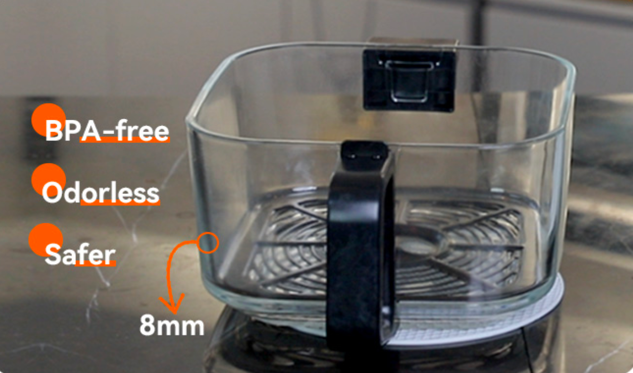 The Airfryer is therefore designed to allow approximately 3 mm of space between the inserted glass basket and the top edge , allowing for optimal air circulation. The fan and heating coil heat the incoming air and distribute it over the food. The air then exits the appliance through the rear vent. This prevents the appliance from overheating, prevents the food from burning, and ensures a beautiful browning.