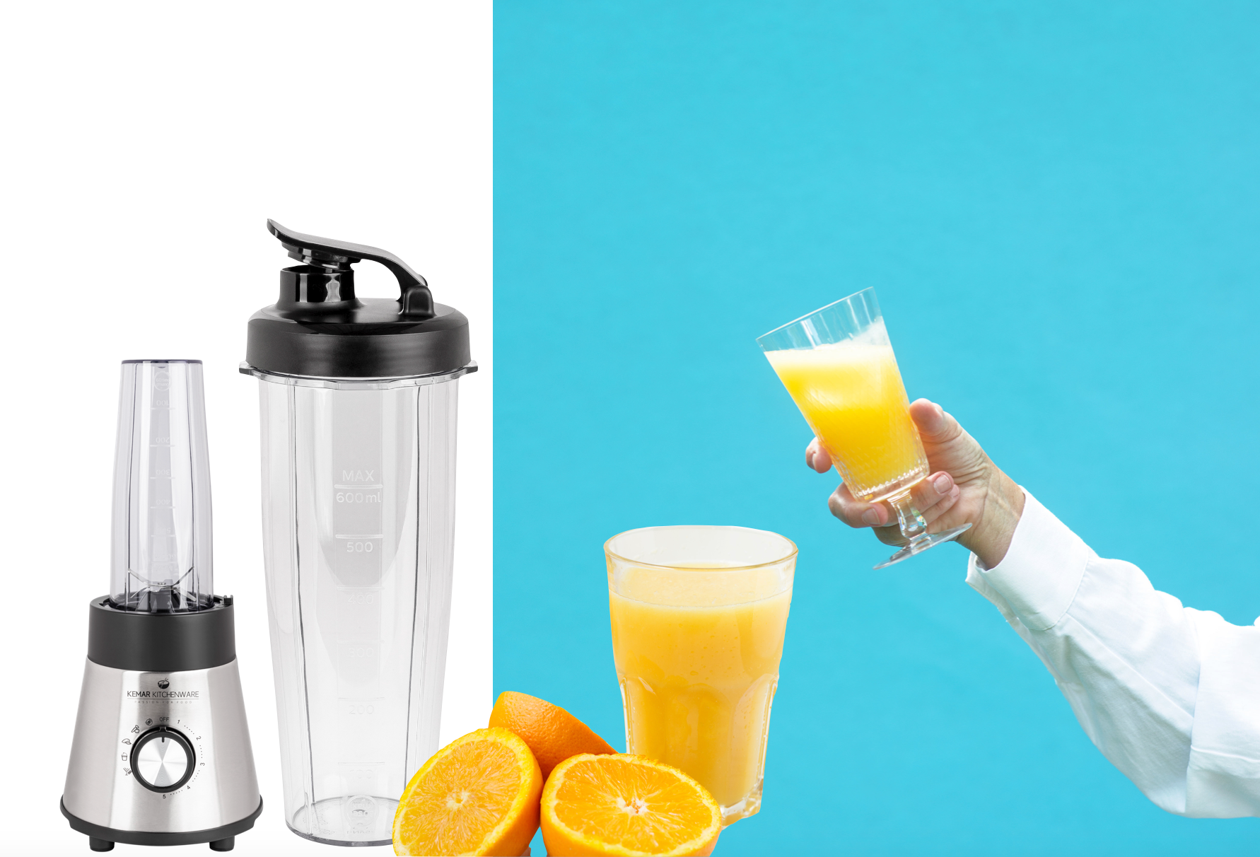 The 50 ml grinder container and flat blade attachment allow you to quickly grind nuts, spices, or garlic. The 600 ml 2Go cup with drinking spout is convenient for transporting after blending. The interchangeable blade fits both the 600 ml 2Go container and the glass blender container.