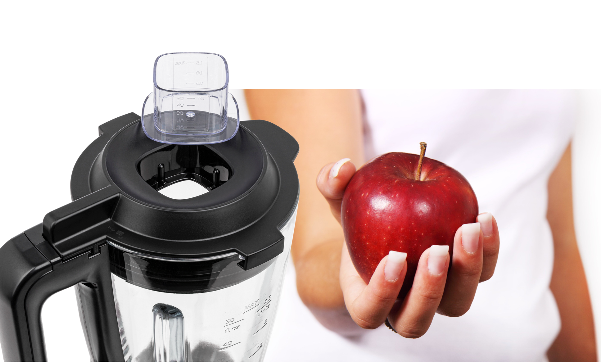 The lid, with its safety lock, features a small transparent refill opening that can be removed during the blending process. The cap has a measuring scale and can be used as a measuring cup.