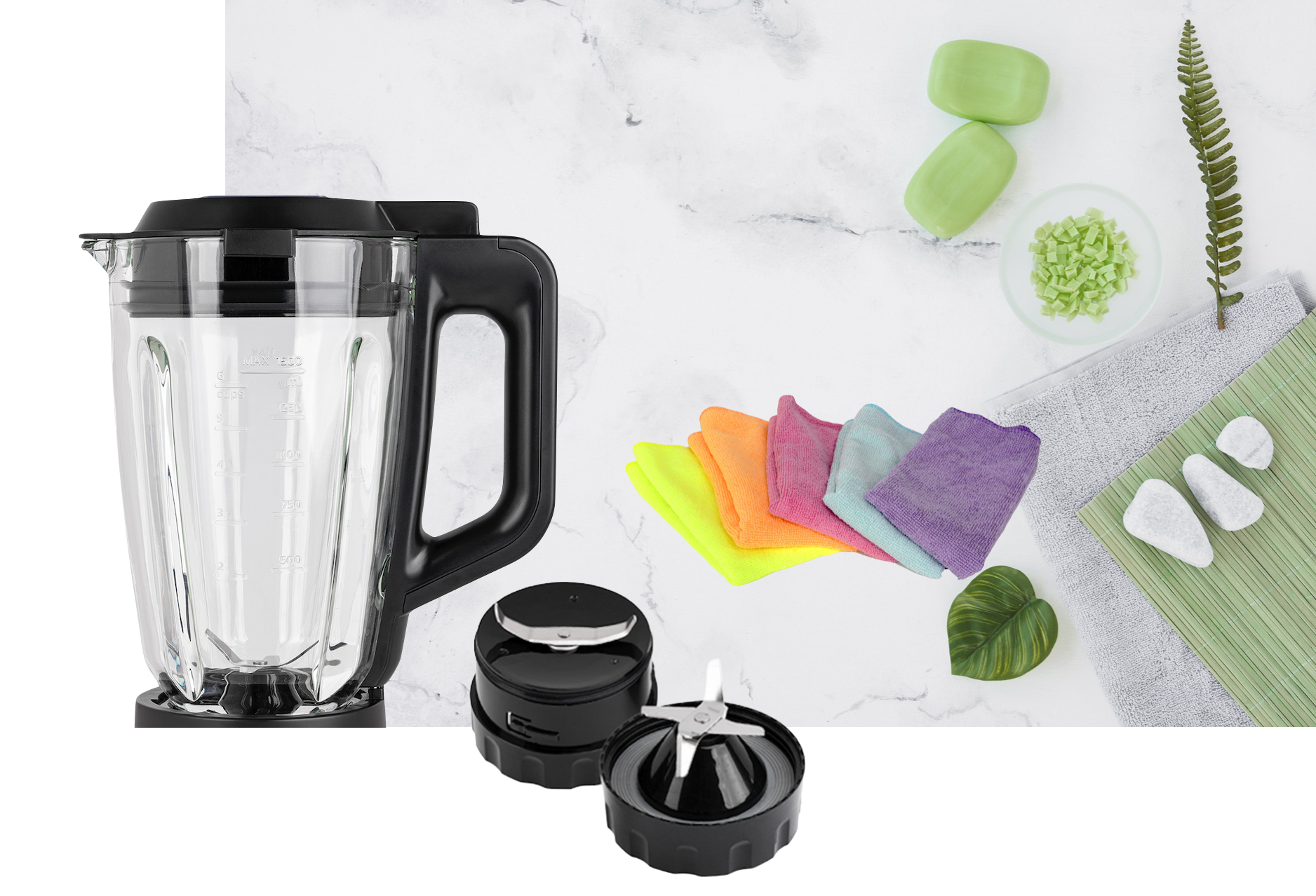 The sturdy glass container has a capacity of 1.5 liters . The 6-blade blender blade can be unscrewed after blending, making it very easy to clean . The lid has a safety lock and a small refill opening . The small transparent lid can be used as a measuring cup .