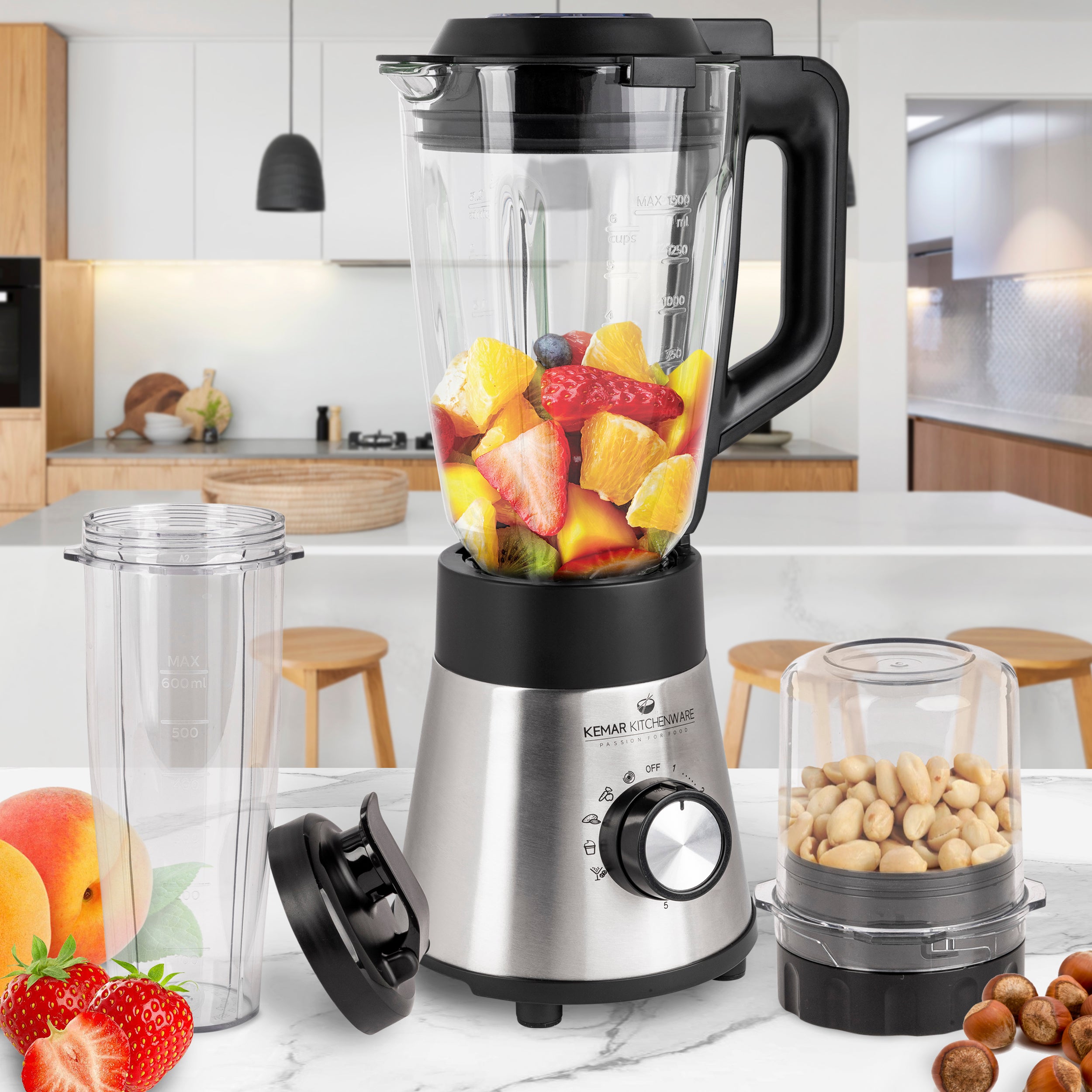 KeMar Kitchenware Blender with 5 automatic programs | BPA-free | 1.5-liter glass container | Removable and easy-to-clean blade attachment | Max. 23,000 rpm | Sturdy steel blades for crushing ice | Cleaning function | Manual speed settings 1-5 | 1,000 watts | 600 ml sports container with drinking lid | 50 ml grinder container with stainless steel flat blade for chopping | With safety lock | Ideal as a smoothie blender