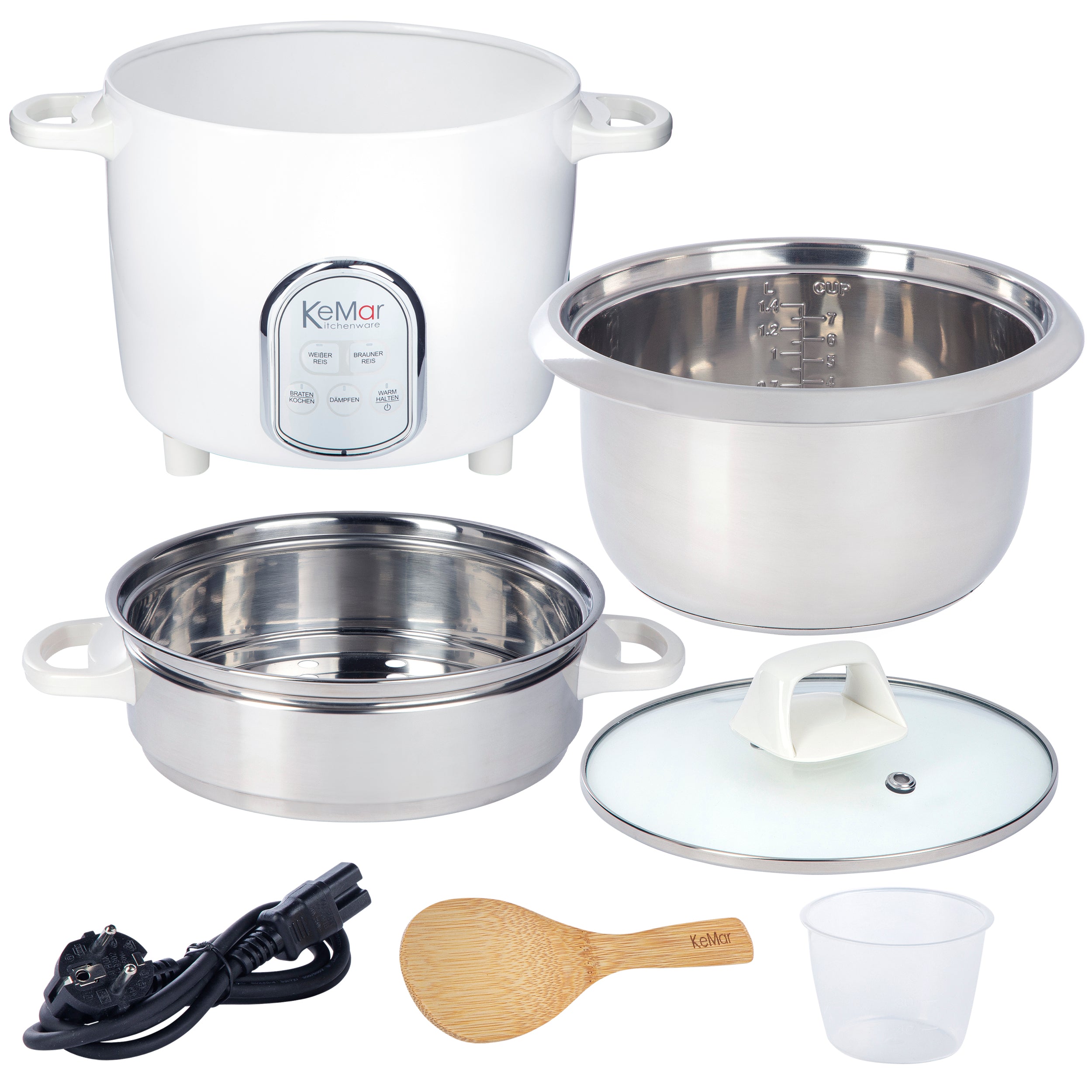 KeMar Kitchenware Rice Cooker | 1.4 liters | 500W | Stainless steel inner pot (stainless steel pot, stainless steel insert, stainless steel bowl) | BPA-free | Keep warm function | Glass lid | Aluminum-free | For 7 measuring cups of rice (160ml per measuring cup) | 4-5 people | 5 programs | Stainless steel steamer insert