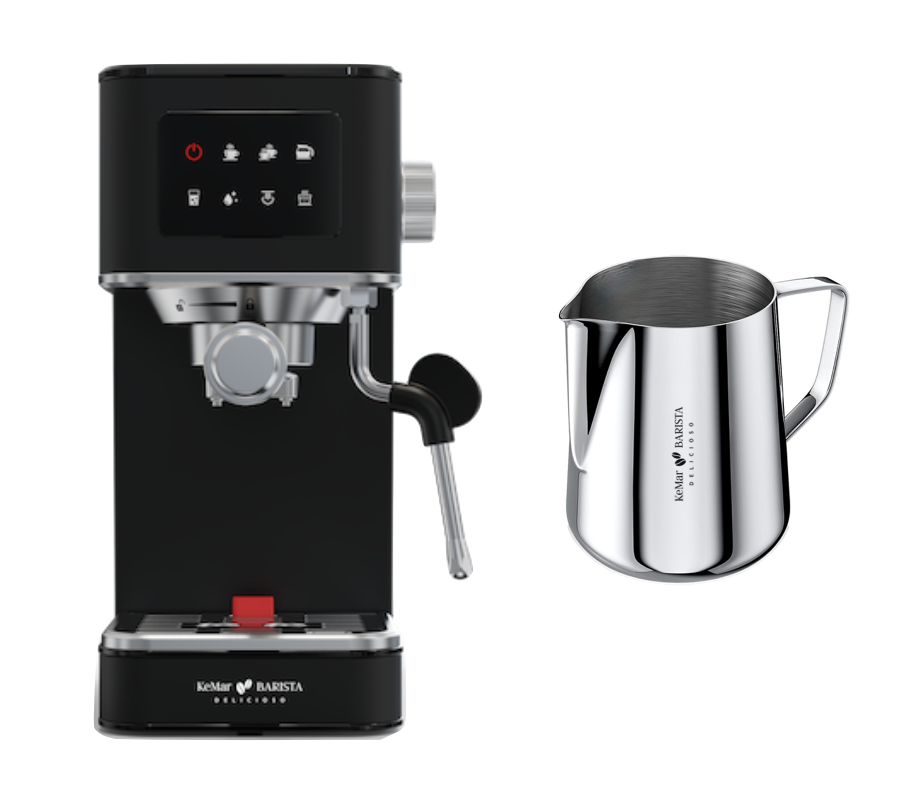 Die KeMar BARISTA DELICIOSO KEM-117 Siebträger Espressomaschine ist die ideale Lösung für Espresso-Liebhaber.Die Espressomaschine ist Dank ihres platzsparenden Designs und der kompakten Größe auch perfekt für unterwegs, im Hotel oder beim Camping geeignet. Mit der italienischen 20 Bar Heizpumpe können Sie Cappuccino, Espresso und sogar kalten Espresso mit Eiswürfeln zubereiten. Das präzise Temperatur-Kontrollsystem sorgt jedes Mal für einen perfekten Geschmack. Die Bedienung erfolgt einfach und bequem über das Touchdisplay und die Reinigung ist dank der Edelstahl-Abtropfschale und der mitgelieferten Utensilien ein Kinderspiel. Mit dem integrierten Milchaufschäumer bereiten Sie perfekten Milschaum zu. Im Lieferumfangs sind bereits ein Messlöffel mit Stampfer, ein Kaffeepad-Sieb sowie ein Kaffeesieb für einen und für zwei Espresso inklusive.
